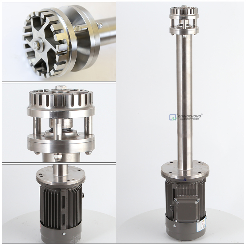 剪切机头采用爪式、双向吸料结构,避免了上部物料难以吸入而造成的死角和漩涡现象,高速旋转的转子产生强劲的剪切力,使剪切率更高,剪切力更强。在转子产生的离心力作用下,将物料从径向甩入定、 转子之间狭窄精密的间隙中,同时受到离心挤压、撞击等作用力,使物料得到充分分散、混合、乳化。